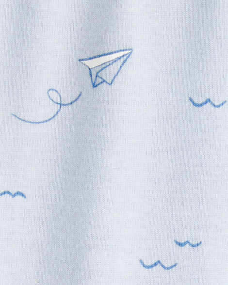 يأتي الطقم بـ أربع قطع متكاملة تشمل: بلوزة ناعمة بأكمام طويلة، بنطال مريح بخصر مطاطي مغطى، طاقية مطابقة، وجوارب لطيفة للحفاظ على دفء قدميه. تصميمه الهادئ بطباعة الطائرات يجعله خيارًا جميلاً للمنزل أو الصور الأولى للمولود.