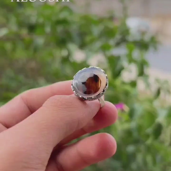 يتوج الخاتم بحجر العقيق المصور اليماني النادر، المعروف بجمال نقوشه الطبيعية وسحر تفاصيله التي لا تتكرر مرتين.