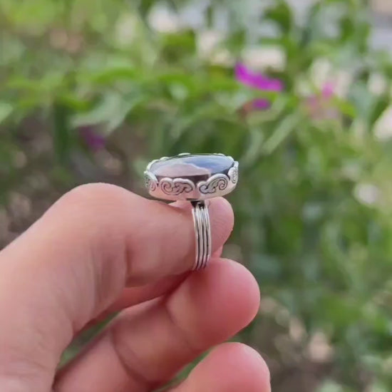 مرصع بحجر العقيق الخرائطي الأسود اليماني النادر، الذي يتميز برسوماته الطبيعية الفريدة وكأنه خريطة محفورة من جمال الطبيعة.