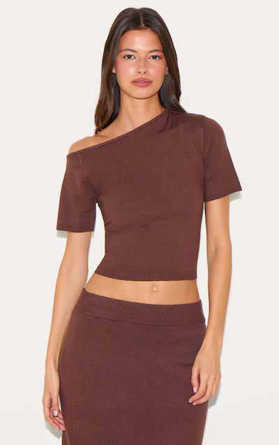 بلوزة شيكولاتة أساسية محبوكة بفتحة رقبة غير متماثلة HKr-0038