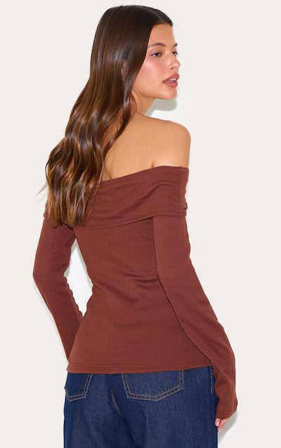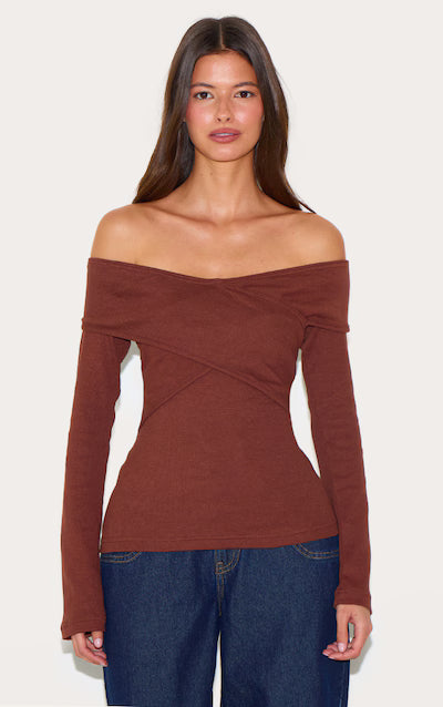 ارتقِ بخزانة ملابسك الأساسية مع هذه البلوزة المميزة بلون الشوكولاتة. تصميمها الطويل بلون الشوكولاتة الغني يُضفي لمسة راقية على إطلالاتك المكشوفة الكتفين. انتبهي إلى خط العنق المتقاطع المصمم بدقة والذي يُضفي لمسةً فنيةً مميزةً ويتيح لكِ خياراتٍ متعددة من التصاميم. قماشها يتدلى بسلاسة، مما يضمن لكِ ملاءمةً مثاليةً تُناسب مختلف أشكال الجسم. نسقيها مع بنطال واسع الساقين مُفصّل من مجموعتنا لإطلالة عصرية أنيقة.