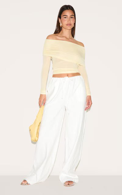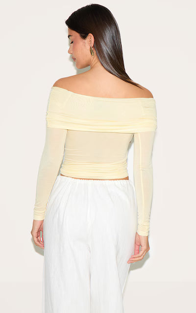 دللي نفسكِ بقطعتكِ المفضلة الجديدة مع هذه البلوزة الليمونية الشفافة الناعمة الملمس والمطوية، بأكمام طويلة. مصنوعة من قماش أصفر باهت، تتميز هذه البلوزة بفتحة رقبة واسعة أنيقة وأكمام طويلة. لإطلالة مثالية، نسقيها مع بنطال أبيض واسع، وصندل مسطح، وحقيبة كتف أنيقة، وأقراطكِ المفضلة.