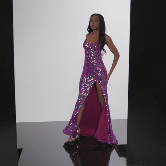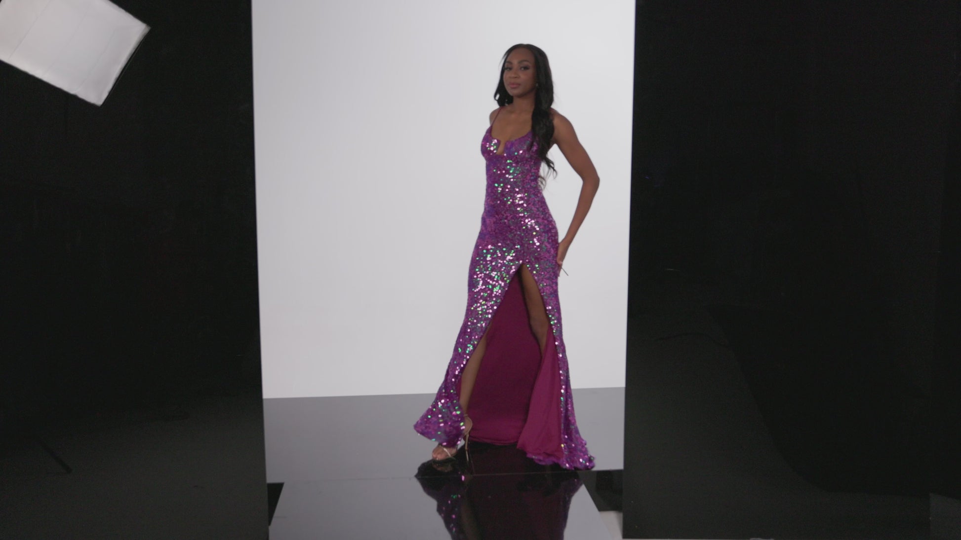 استعدي لجعل الجميع يتوقفون وينظرون إليكِ بانبهار عندما تظهرين بهذه التحفة الفنية من جوفاني 37243. فستانكِ بدون أكمام، مزين بالترتر متعدد الألوان، يلمع ويجعلكِ نجمة المساء. يتميز بأشرطة رفيعة رفيعة، وياقة دائرية بفتحة عميقة، وظهر مفتوح بأربطة. تنورتكِ الضيقة تُبرز قوامكِ برشاقة، مُكملة بذيل طويل وفتحة ساق عالية. إنه بالتأكيد تصميم رائع من جوفاني 37243! عارضة الأزياء ترتدي اللون البنفسجي.