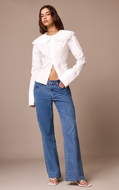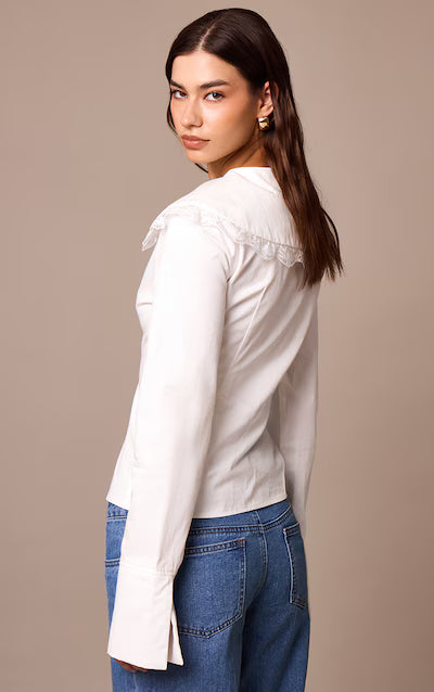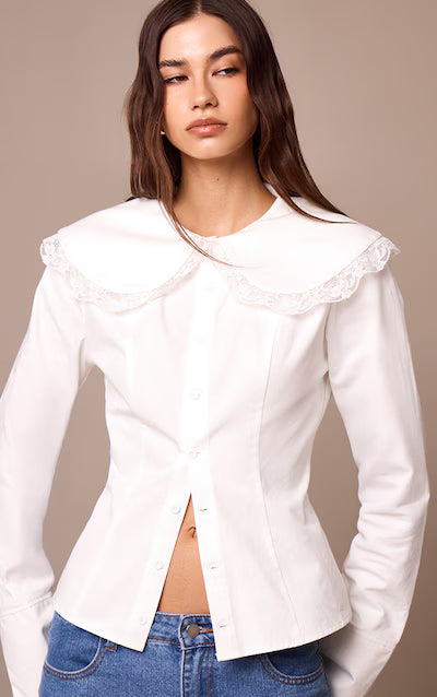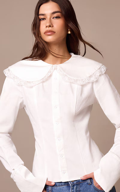 قميص أبيض من القطن بأكمام طويلة وحواف دانتيل HKr-0033
