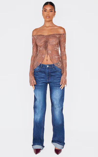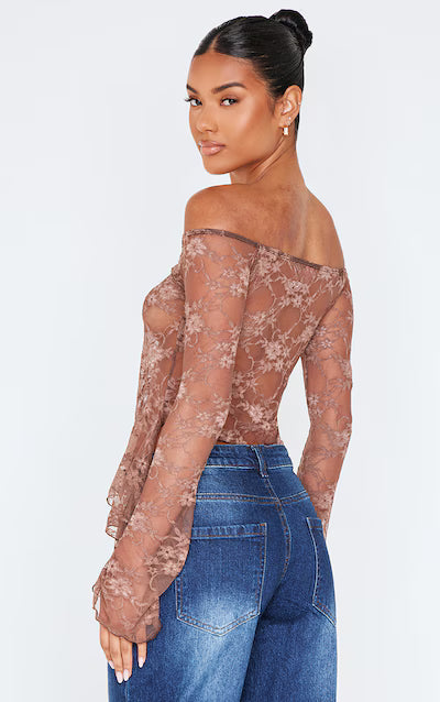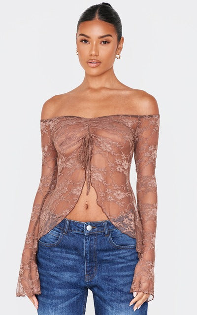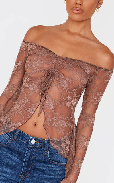 ارتقِ بإطلالتك الكاجوال مع هذه البلوزة ذات اللون البني الداكن المكشوفة، والمزينة بتفاصيل دقيقة من الدانتيل الرقيق. تمنحك فتحة العنق المكشوفة فتحة صدر أنيقة، بينما تضفي الأكمام الطويلة الواسعة لمسة من الرقي. صُنعت هذه القطعة من دانتيل متقن الصنع، وتتجاوز صيحات الموضة العابرة، لتضمن لك أسلوبًا يدوم طويلًا. لإطلالة نهارية مميزة، نسقيها مع بنطال واسع الساقين بخصر عالٍ من مجموعتنا من القطع السفلية.